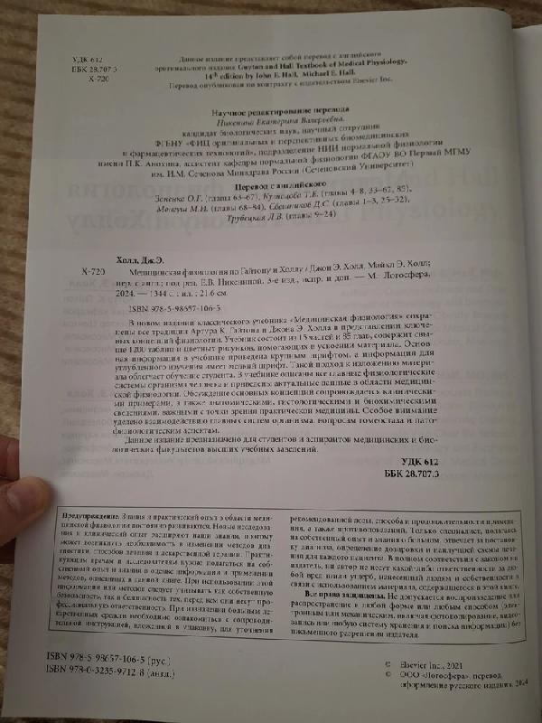 Медицинская физиология по Гайтону и Холлу / Джон Э. Холл, Майкл Э. Холл / Пер. с англ.; Под ред. Е.В. Никениной. 3-е изд., испр. и доп. - М.: Логосфера, 2024. - 1344 с. : ил. : 21,6 см. ISBN 978-5-98657-106-5 В новом издании классического учебника Медицинская физиология сохранены все традиции Артура К. Гайтона и Джона Э. Холла в представлении ключевых концепций физиологии. Учебник состоит из 15 частей и 85 глав, содержит свыше 1200 таблиц и цветных рисунков, помогающих в усвоении материала. Основная информация в учебнике приведена крупным шрифтом, а информация для углубленного изучения имеет мелкий шрифт. Такой подход к изложению материала облегчает обучение студента. В учебнике описаны все главные физиологические системы организма человека и приведены актуальные данные в области медицинской физиологии. Обсуждение основных концепций сопровождается клиническими примерами, а также анатомическими, гистологическими и биохимическими сведениями, важными с точки зрения практической медицины. Особое внимание уделено взаимодействию главных систем организма, вопросам гомеостаза и патофизиологическим аспектам. Данное издание предназначено для студентов и аспирантов медицинских и биологических факультетов высших учебных заведений.